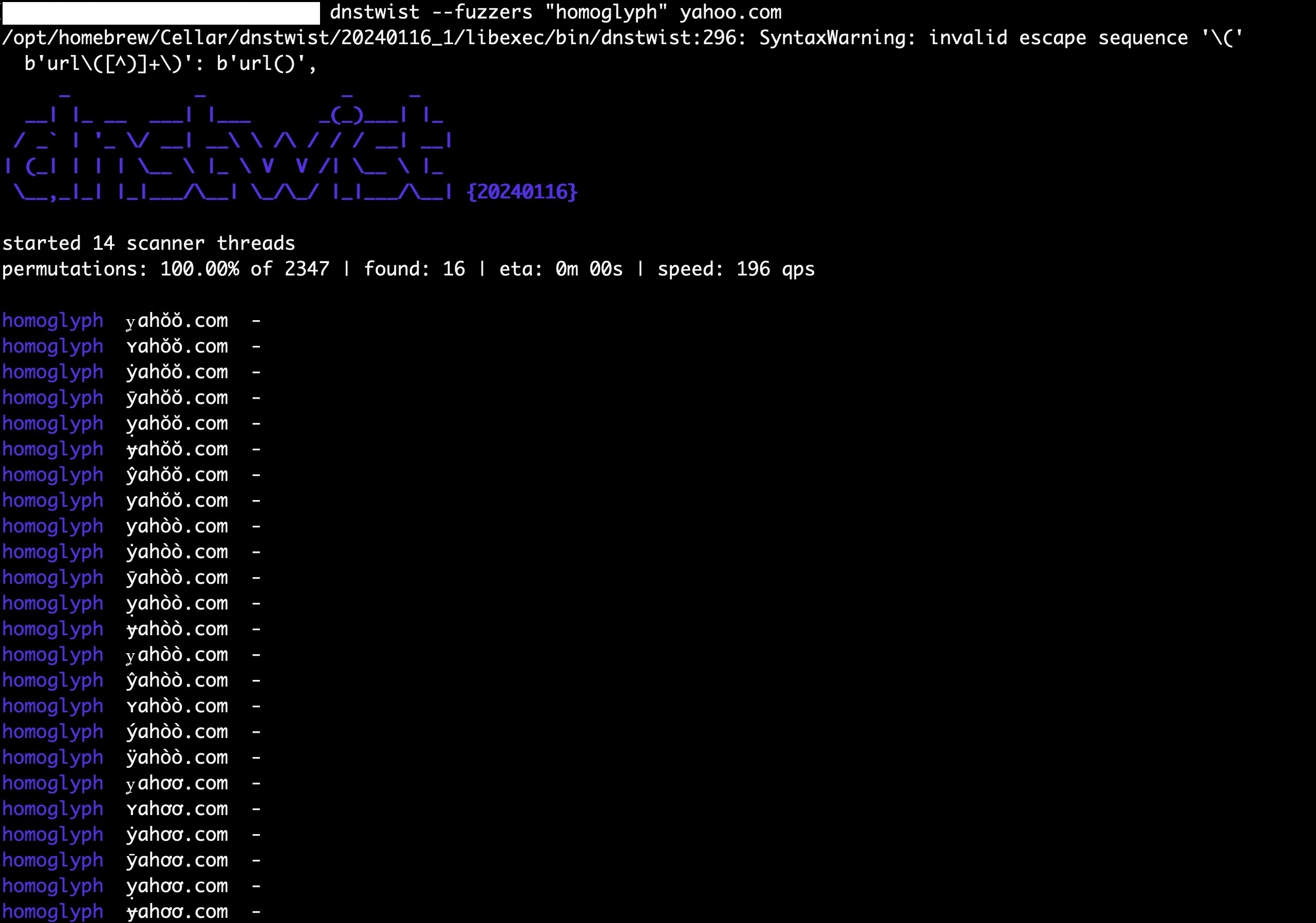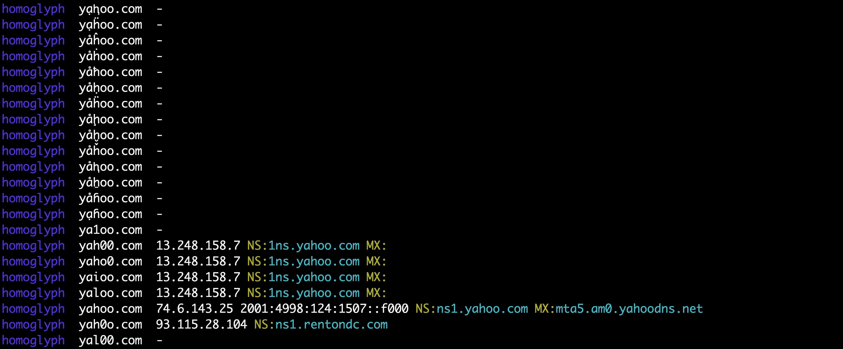 Please find below a couple dnstwist snapshots that contain a partial list of yahoo.com homoglyphs.