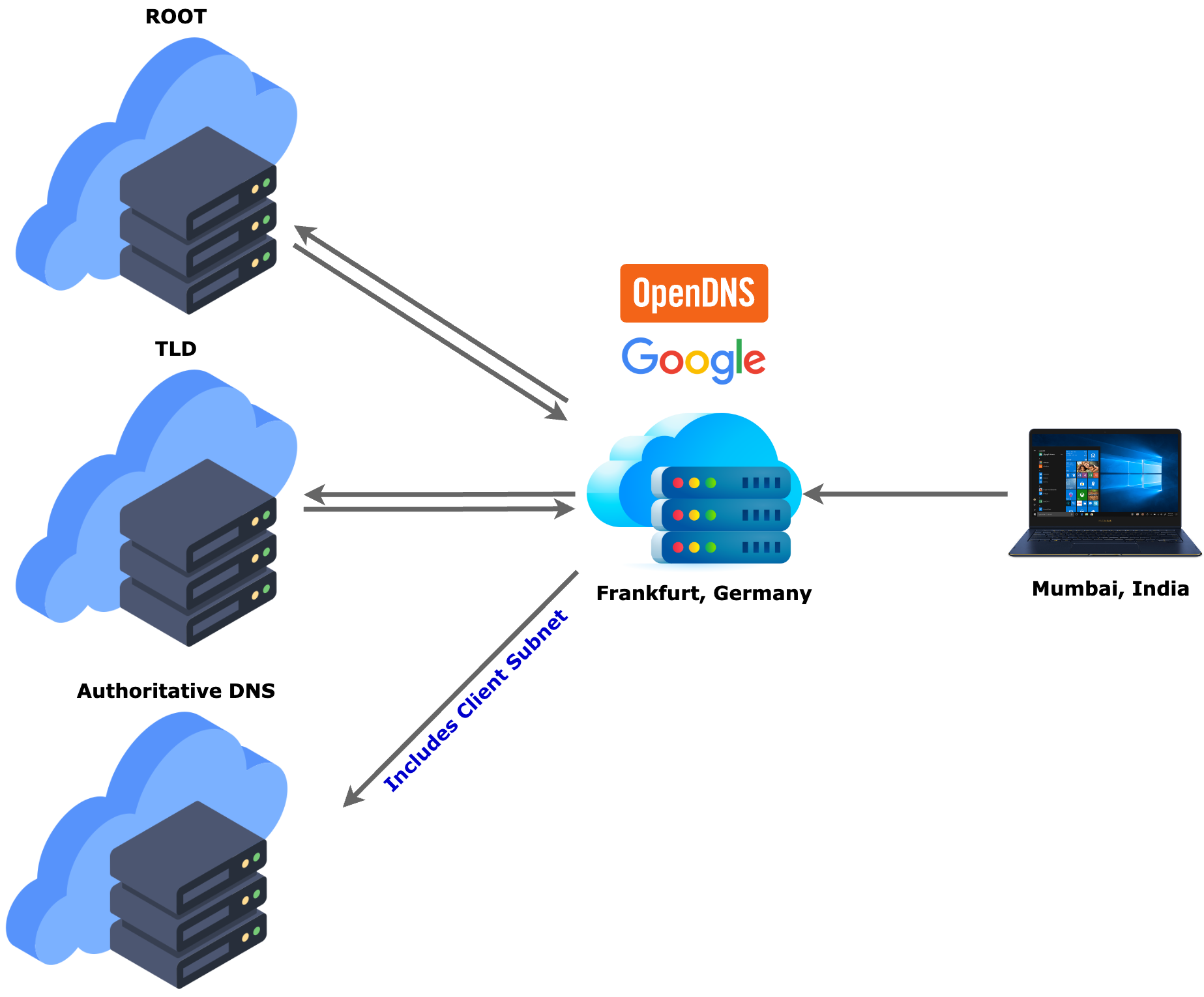 Example : The Authoritative DNS servers of the CDN/reverse proxy service provider see these intermediate resolvers(Public DNS) coming from Frankfurt, Germany, map the client to a CDN node in/close to Frankfurt. This leads to sub-optimal mapping as the client resides in Mumbai while the CDN server resides in Frankfurt.