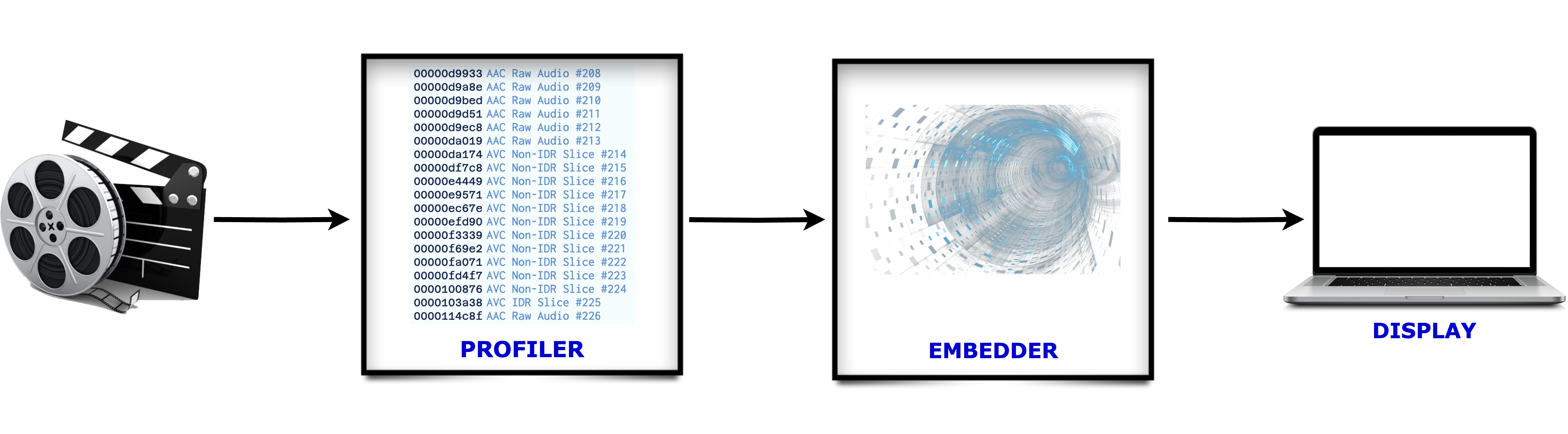 Bitstream Watermarking is a Hollywood approved technique, done in a couple ways, considered quite secure and robust. This type of watermarking involves modification of pixels at the encoder. The Profiler(as shown in the diagram below) analyzes the bitstream to identify locations where watermark can be embedded. The Embedder embed the watermark using metadata computed by the profiler.